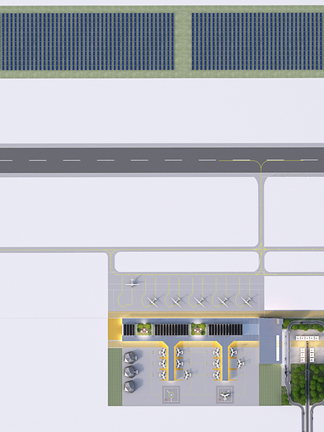 Drawing on existing regional airport assets, the design is deliberately scalable, allowing operators to expand capacity step by step as demand and technology mature. Sustainability is embedded from the outset, with a strong emphasis on on-site energy generation, efficient operations, and a building concept designed for low complexity and future adaptability.